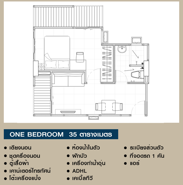 ห้องพักแบบใหม่พื้นที่กว้างขวาง แยกสัดส่วนห้องนอนและห้องนั่งเล่น พร้อมเครื่องปรับอากาศ 2 ตัว (ห้องพักแบบ 1 ห้องนอน)